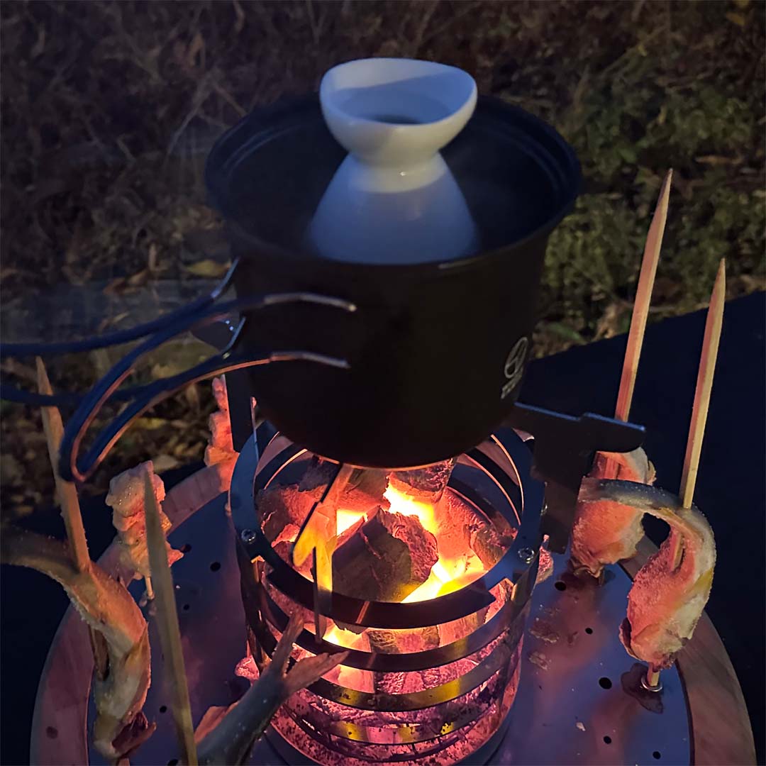 「呑休」にはごとくが付属しています。これを使用することで、炭の上方でお湯を沸かしたり、鍋料理を愉しむことができます。